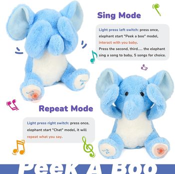 لعبة حيوان محشوة بالفيل الأزرق من Yuhognoys ، لعبة تفاعلية متحركة كهربائية ، نظرة خاطفة بوو ، تكرر ما تقوله عن الموسيقى المصنوعة من القطيفة